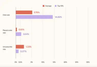 The norm is easy to follow—but the industry-leading top 10% emails convert 5x more subscribers and drive 9x more RPR. For SMS, the top 10% of messages drive 7x RPR versus the average.