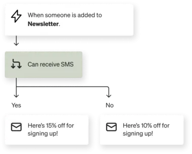 • YES path: Deliver a discount code for 15% off via email because the recipient is subscribed to both channels. You can deliver this code via email.